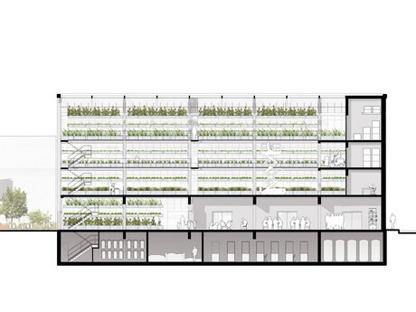 This urban agriculture building is to be realized as part of a city renovation program. "All floors above the ground floor will be dedicated to local production", Corenthin shows. "As for the subsurface, it will be intended to produce mushrooms. The building will consist of 2 wings of 7 m wide each, the eastern greenhouse on the 6th floor and the western greenhouse on the 3rd floor (the first vegetable towers in Europe)."