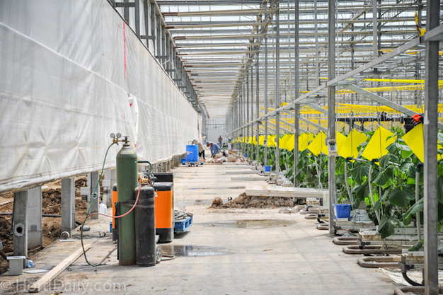 This is one of the two current greenhouses of W.Martens in Beamsville. The greenhouses were floral operations in the past. When Martens acquired them, he took all the benches out and prepared them for cucumber cultivation.