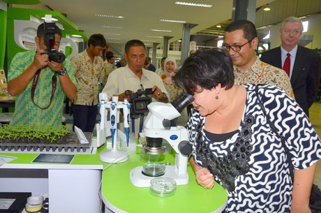 Dutch State Secretary for Economic Affairs Dijksma inspects vegetables produced by Ewindo through a microscope.