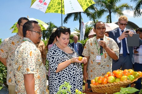 Dutch State Secretary for Economic Affairs Dijksma viewing tomato variety Servo F1. The variety is resistant to the Gemini Virus.