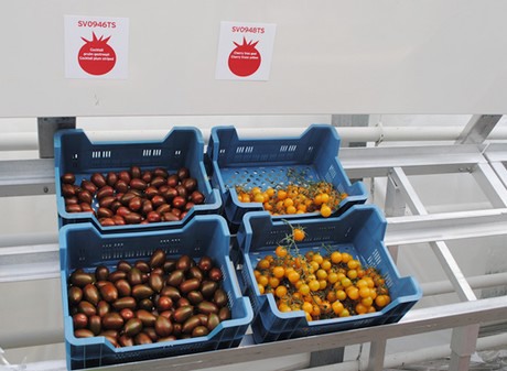The striped tomato SV0946TS and the clear tomato SV0948TS are remarkable. SV0948TS can be harvested loose as well as on a vine and it differs from other tomatoes by its "yellow" taste.