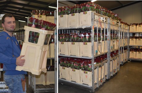 Then, the filled buckets are placed on carts, which are in turn placed in a cooled area of 2°C. Now, the roses are ready for transportation and can be brought to FloraHolland to be sold.