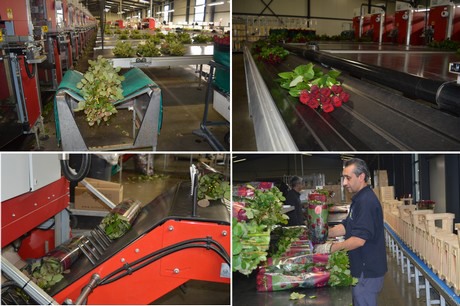 The roses are manually hung onto an machine and checked for quality.