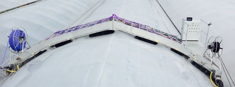 The new machine from Inrha can be designed for any design of double film greenhouse. "We designed the first cleaner especially for a Richel greenhouse structure", Boye said. it is automated; the machine is equipped with a smart computer that connects to the internet. After it is placed over the greenhouse truss it will drive through the gutters to wash the greenhouse with brushes with the help of electric motors. When is nears the end of the greenhouse, sensors will detect a point of return and the machines goes back to the begining of the greenhouse, washing it for the second time."