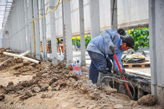 This is where the new greenhouse is connected to the existing structure; the gable of the old greenhouse is removed and the concrete walkway will be the new central walkway of the new greenhouse.