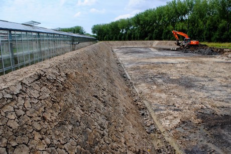In the project in Ridderkerk, the existing reservoir is being renovated. About 10 days ago, the men from Van Daalen began the task here. The old reservoir is pumped out, the silt is removed and the slope and liner removed. Now it is time for the groundwork: the inbetween banks are removed and the capacity of the reservoir is being increased. Thereafer, drainage is brought in and thereafter the liner. This is fixed on the glasshouse side so that no rainwater can seep into the glasshouse - something that was previously a problem for the grower. Finally, the slope covering goes over and then the reservoir is like new.