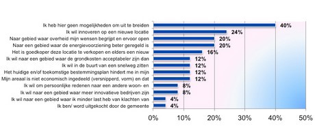 The main reason for a desire to move is the lack of space for expansion. Other reasons include better framework conditions; improved energy, better access and exit roads, better cooperation with the government and less restrictive zoning. The following table shows the respective percentages.