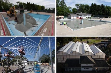 The time lapse video shows exactly how the project was carried out from the start. The engineers designed a greenhouse that could be exactly integrated over the existing situation. The former swimming pool was transformed into a strong foundation for the greenhouse and hydroponic pond. Truckloads with sand and concrete were needed to fill it up.