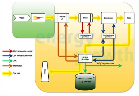 "Our technology cleans the exhaust gas from the biomass boiler based on a method with an Amine scrubber; this process separates the CO2 from the exhaust gas with a special fluid", explained Robert Heikens from Energy4Growth. "This results in clean CO2 that is 99.9% pure, which is ideal for greenhouse production. The good thing from this process is that the scrubber is able to extract only the CO2 from the flue gas, all other residual gas leaves the process via the stack. Furthermore, the process doesn't require to much additional energy; only 0.9 kWh energy from the biomass installation is needed to separate 1Kg CO2 at a temperature of 165 degrees Celsius. However, 65% of this energy can later be returned to the greenhouse, in order to be used at 70 degrees Celsius."