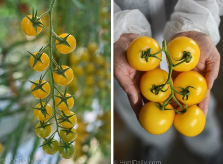 On the left: The C88, an eye-catching cherry on the vine. It is commercially available, and Yvo told us that Gautier received a lot of interest in this variety at the moment. The yellow round fruits have a softer and sweeter taste, with a good brix level and an average weight of 12-14 grams. The variety is vigorous and generative and therefore suitable for long crop production. On the right is another eye catcher: the DJ129, the yellow truss tomato with an intense and deep color. The presentation is very good and remains the same throughout the season. Average fruit weight is 120 grams, and the crop can be grown in heated and non-heated greenhouses. HR resistance to ToMV/Va/Vd/Fol:0/Ff:1-5.
