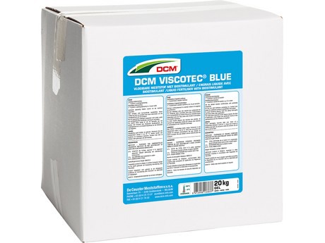 DCM Viscotec Blue is a new, innovative liquid fertiliser authorised for use in organic agri- and horticulture. Its high nitrogen content (9% N), in combination with 5 % potassium (K2O), ensures a quick effect on the growth as well as on the colour of the plants. The highly soluble gel formulation contains no raw materials of animal origin. Dosing is easy and it can be applied with all types of fertigation systems, both for continuous and corrective top dressing.