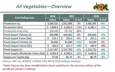 The value of both Australian fruit and vegetables has increased over the 2017-18 financial year, according to data from Hort Innovation's Australian Horticulture Statistics Handbook, released this month.