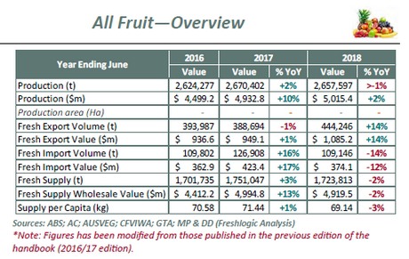 Meanwhile, nearly 2.66 million tonnes of fruit were produced in Australia (down less than 1% on the previous year), with the value of production $5.02 billion (2% increase). However, there was a 14 per cent growth in fruit exports in terms of volume and value.