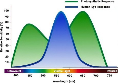 Plants and humans do not perceive light in the same way. The human eye perceives green light as brightest whereas plants utilize mostly blue and red light. Lumen is a unit of luminous flux that relates to the brightness of light visible to the human eye. Luminous flux is calculated by weighting (multiplying) the spectral distribution of quantity of visible light by values representing human eye sensitivity to particular wavelengths. For this reason, a light source having a high lumen value may not always be suitable for growing plants. Lumens are related to lux in that one lux is one lumen per square meter.