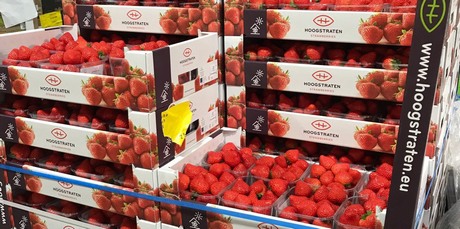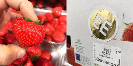 “The strawberries go to auction in Belgium and where the quality is checked,” explains Andy Griffitsh from TG Fruits. “They're graded either up or down depending on the flavour, colour, size and general appearance. The best quality get the golden sticker. Our agent there picks out pallets and sends them over to us, this is what we have on offer this week.”