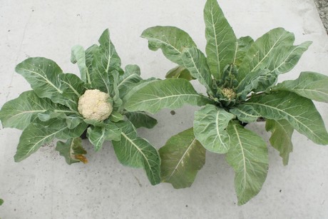 Aneuploid in Brassica. Left a good plant, right a plant with an extra chromosome that causes abnormal growth and no cabbage formation