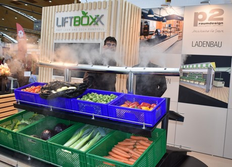 Last year, p2raumdesign won the Innovation Award at expoSE/ExpoDirekt with the brand new LiftBoXX. Exactly one year later, Rainer Palinkasch moved to Karlsruhe again and presented a new, innovative store concept for the farm shop to the specialist public there. In cooperation with refrigeration and cooling specialist RFT, an ultrasonic cold mist humidification system was integrated into a sales system for fruit and vegetables. "We have noticed a huge response from trade visitors," said the managing director on the second day of the trade fair.