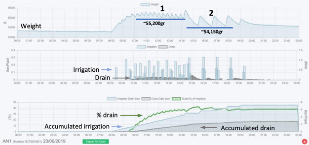 As seen in the graph, water content peaked at 2:00pm, which indicates a short interval before the first long irrigation. Since the irrigation cycles in program 2 had a volume of 610ml, with a target of 30% drain, the first cycle should have started 430gr below the field capacity and weight of 54,706gr (2:55pm). Subsequently, the lower water content that was maintained during this period also helped to promote root development, avoided root diseases, improved plant resistance to pathogens, and allowed for the runoff of minerals.
