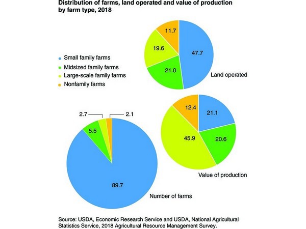 The research found that family farms remain a key part of U.S. agriculture, making up 98% of all farms and providing 88% of production. Most farms are small family farms, and they operate almost half of U.S. farm land, while generating 21% of production. Midsize and large-scale family farms account for about 66% of production; and non-family farms represent the remaining 2.1% of farms and 12% of production.