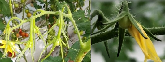 The setting of tomato flowers is an extremely important process. Growers will be able to recognize how the quality of tomatoes and the fruit size will be at harvesting when they look at the early stage of fruit development. If the setting is good, as is pictured above, the fruit is similar in size and properly sequenced.