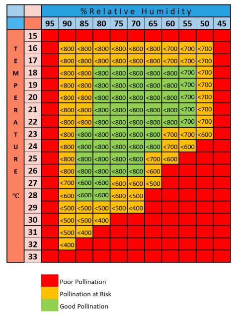 Earlier in this article, the limits for good pollination related to temperature and humidity were given as separate quantities. It is true that to prevent poor setting through exhaustion, a higher temperature can be kept if it is accompanied by higher humidity. A temperature of 30 degrees Celsius at a humidity of 85% will still result in good pollination. At 30 degrees Celsius and 60% humidity the pollination will suffer.