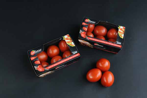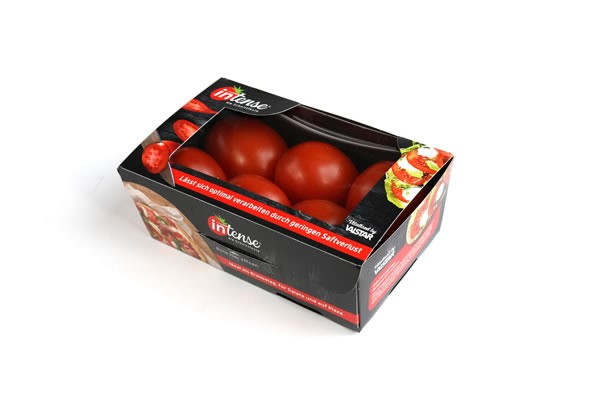 Valstar has developed a new package to better highlight the characteristics of the Intense tomato. Under the Intense logo “die Schnittfeste” has been added to emphasise the firm structure of the tomato. The most used applications has a picture and you will find a recipe for pizza and sandwich on the packaging. In this way it is clear at a glance what the tomato is for.