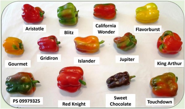 The sweet pepper varieties included in the study were (referred to here by their common names) Aristotle X3R, Blitz, California Wonder, Flavorburst, Gourmet, Gridiron, Islander, Jupiter, King Arthur, PS 09979325 X10R, Red Knight X3R, Sweet Chocolate, and Touchdown.
