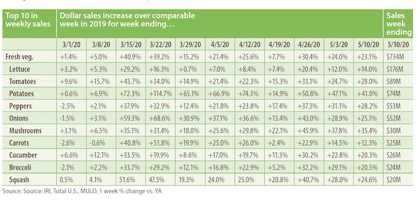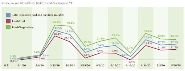 Compared with the same week in 2019, fresh produce generated an additional $209 million in sales during the week of May 10. Growth rates were in line with last week’s levels. Fresh vegetables, at +23.1%, continued to easily outperform fresh fruit and boasts double-digit increases for eight out of the last nine weeks.