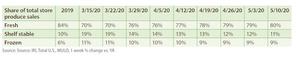 Fresh produce gains remained highly elevated the second week of May. Fresh produce growth for the week of May 10 versus the comparable week in 2019 increased 17.1% — virtually unchanged from the prior week. Fresh vegetables continued to easily outperform fruit, but both achieved double-digit increases. Meanwhile, consumer interest in all three temperature states for fruits and vegetables continued, with dollars split between fresh, frozen and shelf-stable. Frozen once more had the highest gains, up 39.2%, despite continued high out-of-stocks in the frozen food aisle.