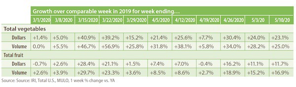 Both vegetables and fruit saw volume growth tracking ahead of dollars the week of May 10 versus the comparable week in 2019.