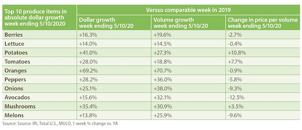 “Fruit is hitting its stride here in the past few weeks,” said Parker. “While vegetables have seen a stronger performance during the pandemic, it is also fair to point out that vegetables had been outperforming fruit for a few years. The pandemic amplified that difference, but we see continued strength in items like oranges, lemons, avocados and berries — all sales powerhouses.” Seven out of the top 10 items in terms of dollar sales saw double-digit increases during the week of May 10 versus the comparable week in 2019.