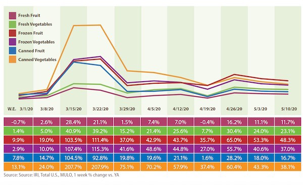 Consumers continued to split their fruit and vegetable dollars three ways during the week of May 10. In addition to the strong performance of fresh vegetables, frozen and canned vegetables had ongoing strong growth during the second week of May as well. Vegetables continued to have higher gains in shelf-stable, but frozen fruit is gaining faster in frozen.