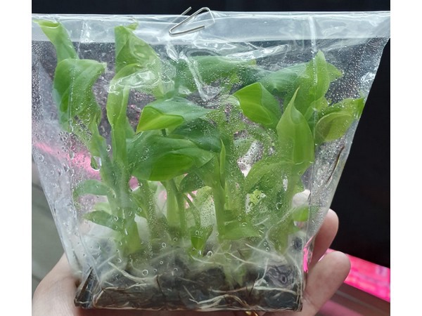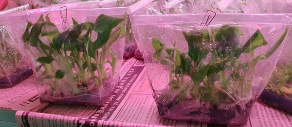 Banana tissue culture in an A/B test with HortiPower lighting (left side) and regular LEDs (right side)