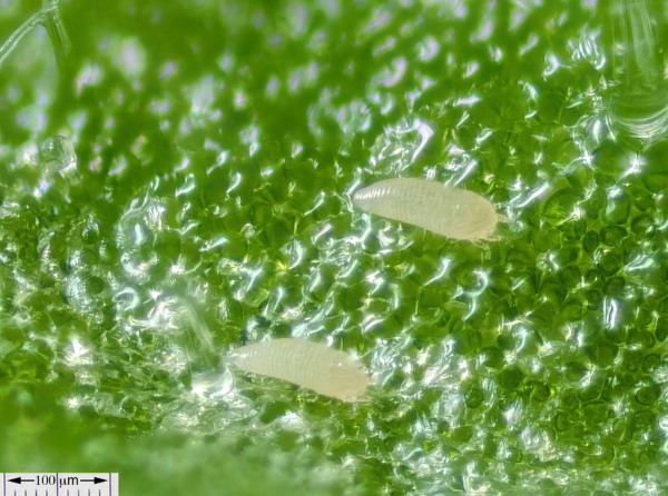 Two individuals of the tomato russet mite, Aculops lycopersici, on the epidermis of a tomato leaflet. The genome of A. lycopersici was sequenced and revealed mechanisms that underlie metazoan genome reduction. Scale bar represents 0.1 mm. Picture: Jan van Arkel.