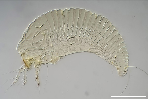 Microscopic slide image of the eriophyoid mite Aculops lycopersici, a global pest on tomato. The genome of A. lycopersici was sequenced and revealed mechanisms that underlie metazoan genome reduction. Scale bar represents 0.05 mm. Picture: Jan van Arkel.