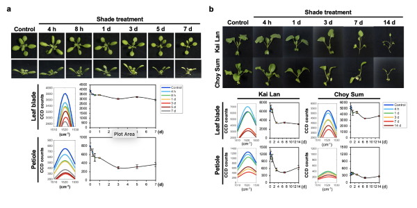 Raman spectroscopy and the carotenoid Raman peak allows for early detection of Shade Avoidance Syndrome (SAS) in the (a) model plant Arabidopsis thaliana and (b) leafy vegetables Kai Lan and Choy Sum. Diagrams adapted from Sng et al., 2020. Plant Methods 16: 144. Credits: SMART