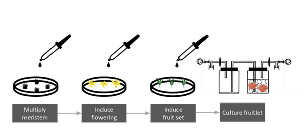 Firstly, a source of stem cells is required. These are then multiplied. For lab-grown fruit, the stem cells come from the meristem in the plant shoot tip. “This is basically something we have to optimize a little bit and make sure that we get a good system going because, once we have lots of meristems, then we can do all our experiments with that.” - Part 2: “The big fundamental question: how do we induce flowering in those meristems?” “We’ve found what we really think is a breakthrough technology by inducing those flowers without making use of genetic modification.”