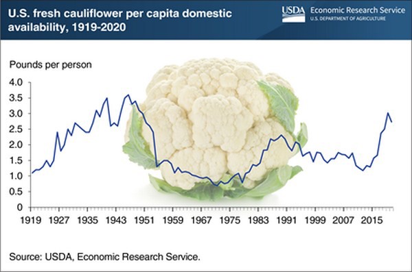 Consumer interest in cauliflower has been re-emerging in recent years. Fresh cauliflower was popular in the early 20th century, with per capita availability peaking in 1946 at a record 3.6 pounds. Its popularity rose again in the late 1970s and 1980s before falling to 1.2 pounds per capita in 2012, then began to rise, reaching 3 pounds per person in 2019.