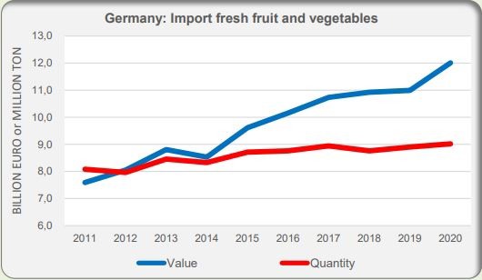 In 2020, Germany imported a record amount of fruit and vegetables. Quantity-wise, imports exceeded the nine million ton mark for the first time. This was one percent more than in 2019. In terms of value, imports grew by almost ten percent to €12 billion. Over the past decade, German fresh fruit and vegetable imports have increased slowly but surely. They've crept up from eight to nine million tons.