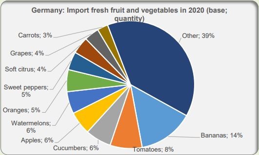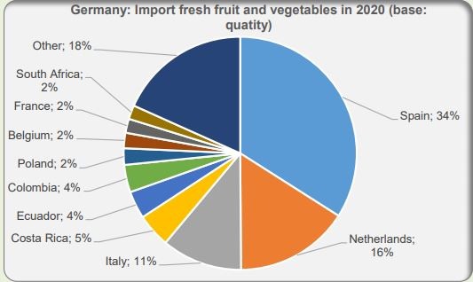 Spain, the Netherlands, and Italy are Germany's main suppliers. It's difficult to give a precise figure for Dutch and, to a lesser extent, Belgian products sold on the German market. A lot of fresh fruit arrives at various Dutch and Belgian ports. Most of this is destined for other EU-27 countries, especially Germany.