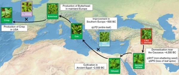 Iceberg lettuce, oakleaf lettuce, romaine, and all other lettuces that we eat nowadays, descend from wild plants that were modified 6000 years ago in the Caucasus so that plant oil could be harvested from the seeds. After the ancient Greek and Romans further bred the plants to use them as leafy vegetables, lettuce also ended up on our plates over time. The special history of lettuce has been described in detail thanks to the DNA analysis of 445 types of lettuce, conducted by Wageningen University & Research and the Chinese BGI. Their research will be published today in the authoritative periodical Nature Genetics and opens the door to faster and more effective breeding of more resilient food crops.