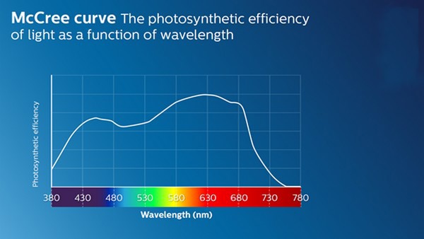In the early 1970’s, McCree measured the photosynthetic efficiency as a function of wavelength for a large number of plants. These data show a large commonality between the plants and has been averaged to what is now known as the “McCree curve”, see figure 1 below.