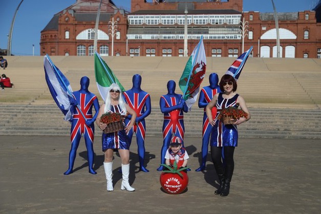 Now, flying the flag for British Tomato Fortnight, grower of top-tier premium tomatoes, Flavourfresh, have come up with their own British-grown recipe for tomato success…at Blackpool Tower. The ingredients? Four Union Jack sprites, two British iconic dresses, a mini-mascot and a huge tomato – seasoned with Spring sunshine, mixed well and placed on the steps of the iconic Lancashire landmark.