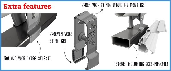The narrower design of the clamp allows more sunlight to reach the crop. This is, of course, beneficial for the yield. The convexity of the console provides extra strength and better sealing of the screen profile, so that less heat and light is lost. There are also grooves on the underside for extra grip on the truss, and there is a groove on the top for the pre-mounted drive tube. This makes the console easier to mount.