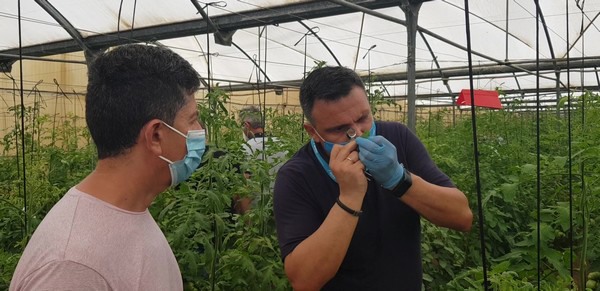 Lastly, agricultural producers and technicians toured the farm with magnifying glasses in hand to check the effectiveness of the protocols and biological control tools against Tuta absoluta in tomato plants.