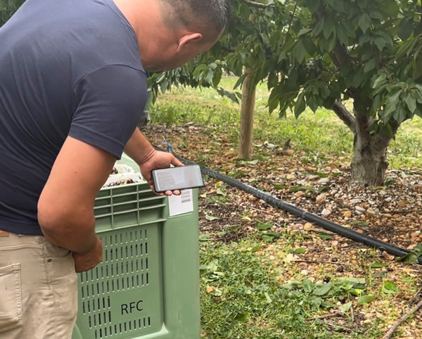 "The harvest recording method is actually very simple." Take cherry cultivation – all you need is a smartphone and a roll of personalized barcodes for each worker. As soon as an employee's cherry container is full, they attach a unique sticker to it. That container's handed to the supervisor, who scans the barcode. The container's then placed in a crate or on a pallet.