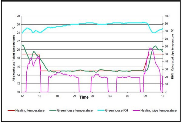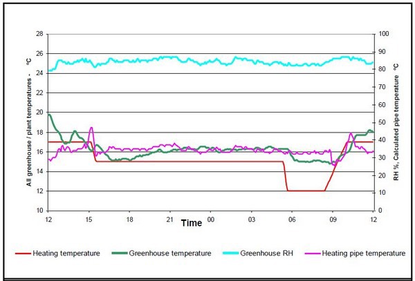 If we look at the night period we can see that the greenhouse with humidity control had an average RH of 85% compared to 90% in the ‘no control’ greenhouse. However, to achieve this, the pipe temperature in the humidity control house was 10oC hotter.