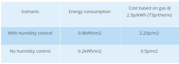 On this night the active humidity control used 0.7kWh/m2 more energy, costing an additional 1.75p/m2. Based on the plant density of 9 plants/m2, the cost of humidity control on this night was therefore 0.2p/plant.