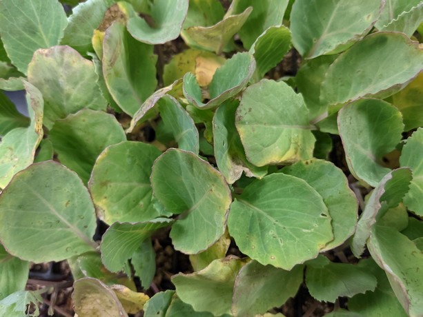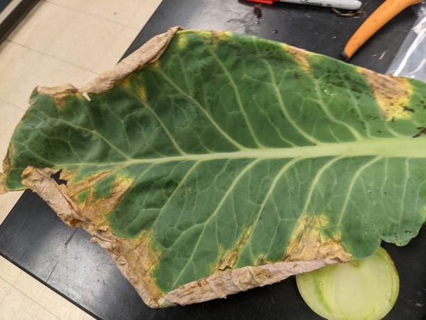 Xanthomonas campestris pv. campestris, the causal agent of black rot of crucifers, can cause severe disease in several species of Brassicaceae, including broccoli, Brussels sprouts, collard, cabbage, cauliflower, kohlrabi, rutabaga and turnip. Crop losses of 50% are not uncommon under conditions conducive to rapid spread of the pathogen. Symptoms include wilting and collapse of seedlings, necrosis at leaf margins (figure 4.) and interveinal, V-shaped lesions on mature plants (figure 5.). Bacterial blight on geranium is caused by Xanthomonas hortorum pv. pelargonii. This disease is specific to and one of the most important diseases of Geranium and Pelargonium. Symptoms vary depending on species and typically include water-soaked lesions, progressing to form larger, V-shaped lesions, similar to those observed in black rot infections. Bacteria often invade the vascular system and cause wilting and eventual plant death.