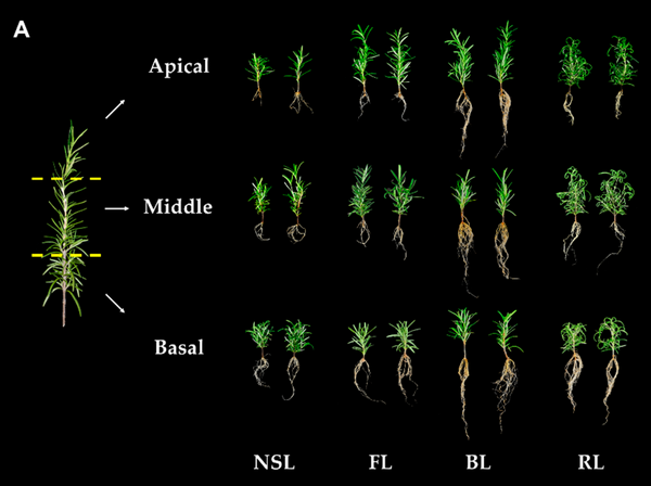 Here, rooting efficiency of apical, middle, and basal cuttings from rosemary stems was evaluated by controlling light conditions to prevent irregular rooting. The types of light applied to the cuttings were natural sunlight (NSL), fluorescent, red, and blue (BL) light.
